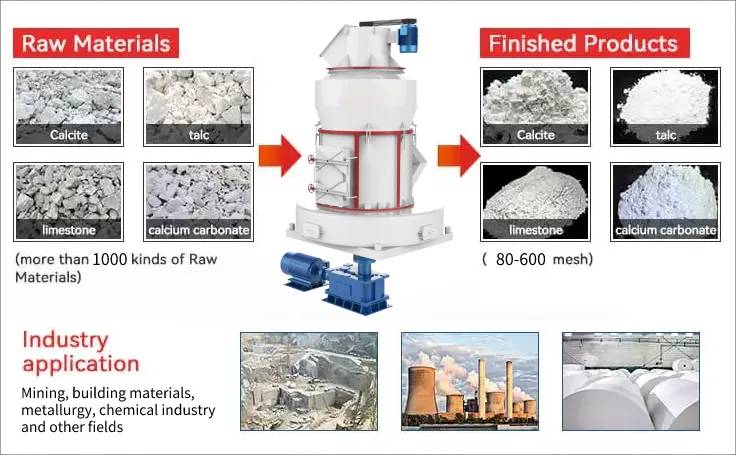 CLIRIK high-pressure suspension roller mill is a type of ultra-fine mill, suitable for the processing of various non-flammable and explosive ore raw materials with a Mohs hardness below 9.3 and a humidity below 6%. It is widely used in metallurgy, Building materials, chemical industry, mining, highway construction, water conservancy and hydropower and other industries, especially for processing quartz, feldspar, calcite, limestone, talc, ceramics, marble, granite, dolomite, bauxite, iron ore, barite , bentonite, coal gangue, coal and other materials have special advantages, and the fineness of processed finished products can be adjusted arbitrarily between 0.613mm and 0.033mm.