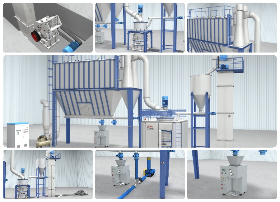 At the same time, the fine powders clinging to the surface fall down by the sudden vibration of the filter bags, which is caused by the instantly ejected high-pressure gas controlled by the pulse valve. The materials from the above two lots are sent by the conveyor at the bottom to get finished powders packed. In addition, filtered clean air will be emitted from the air outlet of muffler in the end.